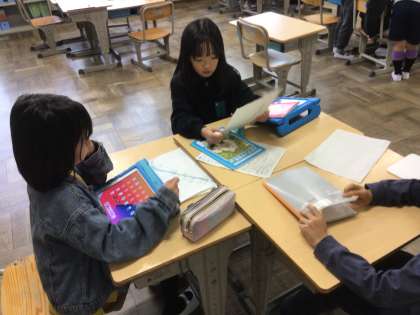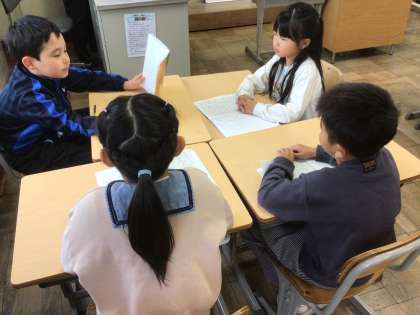 国語「見つけたことを話そう」では、グループごとに考えています。写真を選んだり、文章を考えたりしました。