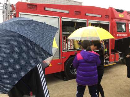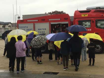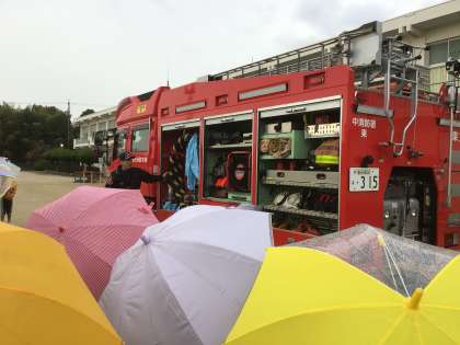 お話をお聞きした後、実際に消防車を見せていただきました。あいにくの雨でしたが、傘をさしながらポンプやホースなど、シャッターを開けて見せていただきました。
