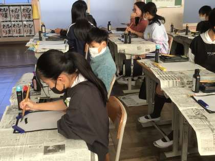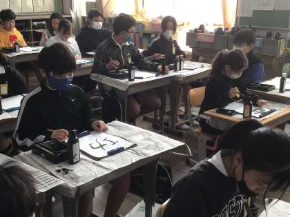 6年生書写では、「今の自分にふさわしい言葉」を考えて、漢字1文字か2文字で表して書きました。「幸」「新」「友」などどんな感じがふさわしいか考えて書きました。