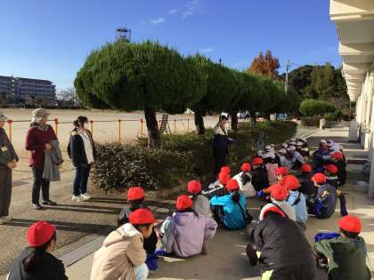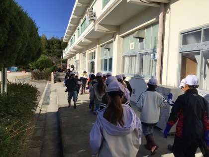 4年総合の時間を活用して、岩本川に出かけました。長靴に履き替えて学校を出発です。ボランティアの方々にも見守られながら、移動をしました。