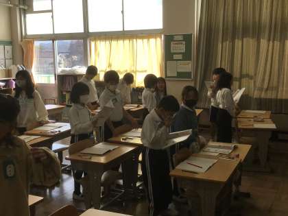 2年生算数では「九九」の学習をしています。今日は「九の段」の九九をつかって、答えを求めました。九九をペアで言ったり、答えを求めたりしました。