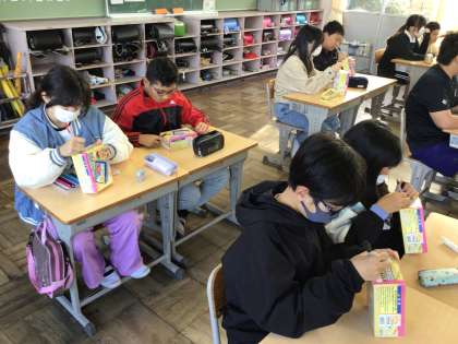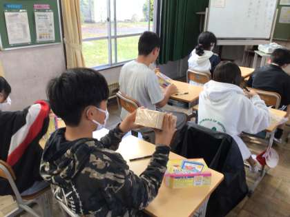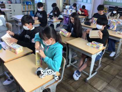 6年図工では、思い出に残る作品を制作しようの単元に入ります。これからどんな作品を作るのか概要説明を聞いた後、グランドボックスという教材が配られ、名前を書いたり、箱の中身の確認をしていました。