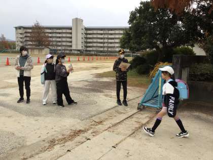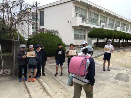 校門でやまびこ委員が元気よくあいさつ運動を行っていました。気持ちのよいあいさつで一日が始められるので素敵ですね。