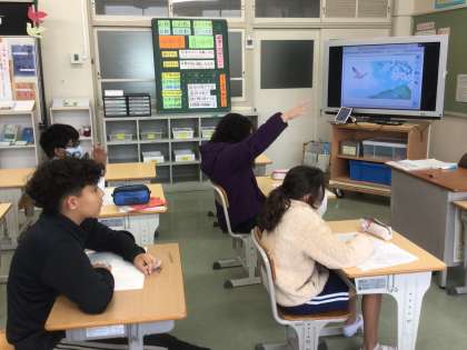 12/3 5年生国際学級国語 公開日 2025/12/03 更新日 2025/12/03 各学年から 5年生国際学級国語では、「大造じいさんとがん」の学習をしています。今日は4場面の内容を読み取り、1番よかったところを見つけて発表しました。