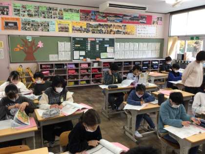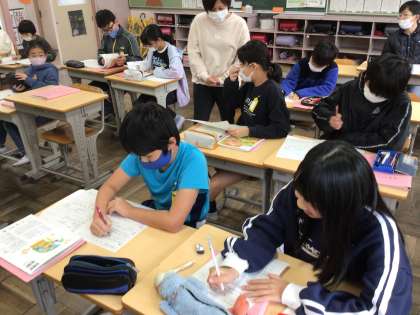6年家庭科では、夏をすずしくさわやかにの単元を復習していました。教科書を調べたり、先生に質問したりしながら、ワークシートに記入をして、テスト対策をしていました。
