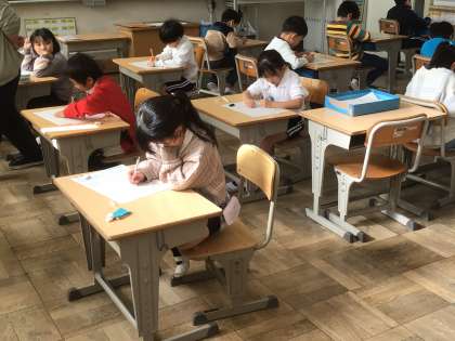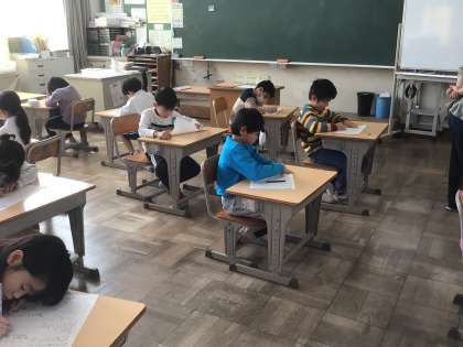 2年生国語ではテストをしました。「まちで見つけたことを話そう」「なかまになることば」「ありがとうをつたえよう」のテストです。集中して問題を解いていました。