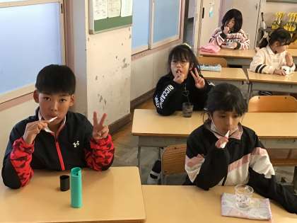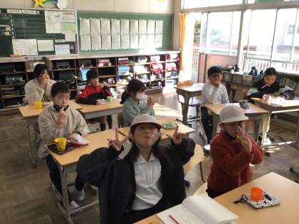 12/4 給食が終わると… 公開日 2025/12/04 更新日 2025/12/04 各学年から 給食の片付けが終わると歯みがきタイムです。リズミカルな曲に合わせて歯みがきをしました。きちんと歯を磨いて虫歯の予防をしていきましょう。