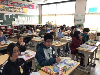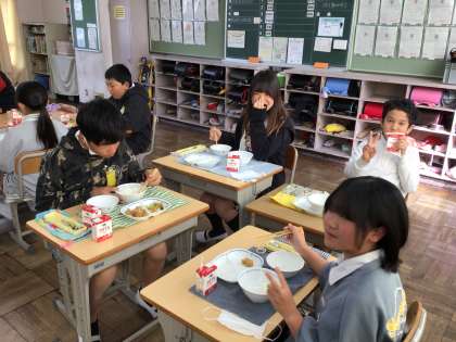 今日の献立はごはん、牛乳、とり肉のおろしソースかけ、アーモンドあえ、豆乳のバランスみそ汁です。