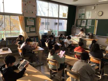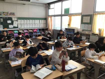 教室で朝の支度を行い、チャイムがなると静かに読書が始まりました。いい姿勢で本を読むことができていますね。