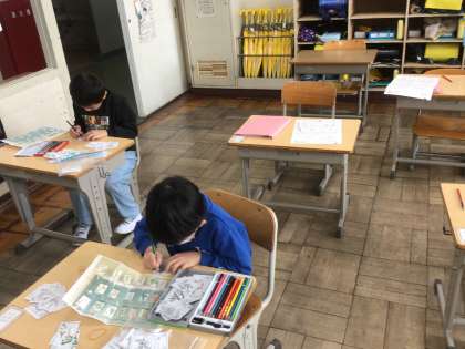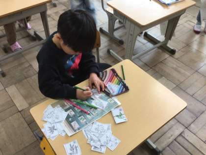 1年生国語では、「やまびこカルタ」を覚えています。一人一人カルタを切って、きれいに色塗りしています。