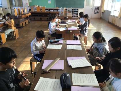 12/9 3年音楽 公開日 2025/12/09 更新日 2025/12/09 各学年から 3年音楽では、音楽ワークを使って、リコーダーの運指や音楽記号について復習をしました。また、リコーダーで「聖者の行進」や「メリーさんのひつじ」を練習しました。旋律の重なりの学習をしているので、1番と2番パートを重ねて演奏をしてみました。