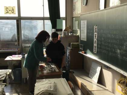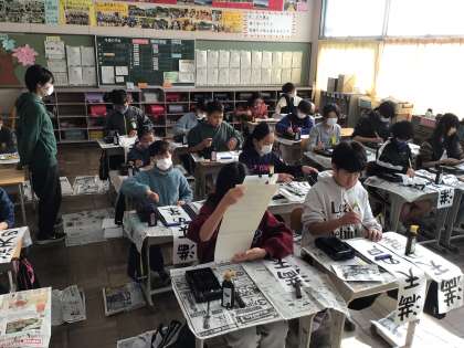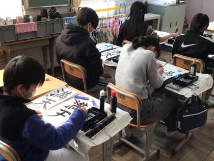 12/15 6年書写 公開日 2025/12/15 更新日 2025/12/15 各学年から 6年書写では、今年度2回目の書写ボランティアによるご指導を受けながら、書き初め大会の練習を行いました。「満天の星」は画数が多いので、字のバランスをとりながら書き上げるのが難しいようです。集中して練習する姿はさすが最上級生ですね。