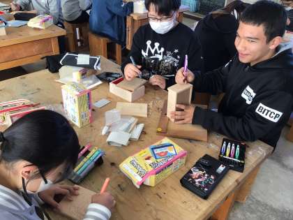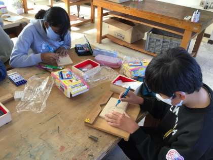 6年図工では、卒業制作をしています。グランドボックスの板に転写をして、まず浮き彫りにする部分を掘り進めていました。失敗しないように丁寧に彫っていました。