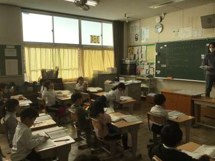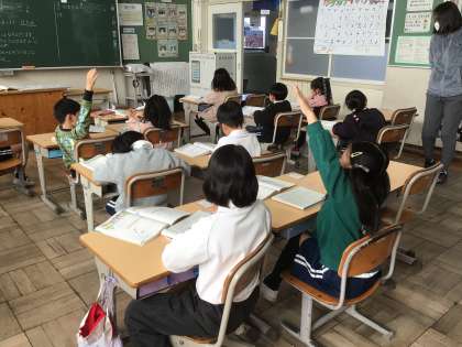 1年生算数「ものと人の数」の学習で、前から何番目、後ろから何番目か、何人かを考えて、全部でなんにんいるかを考え、発表しました。