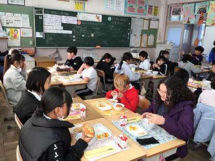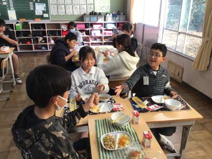 今日の献立はビーフン、りんごポンチです。友達との会話を楽しみながら、給食の時間を楽しんでいました。