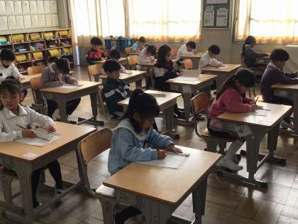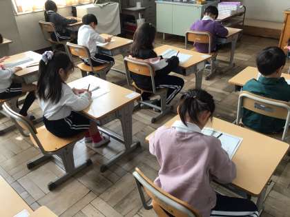 1年生は、書き初めの練習をしています。「学校で、ヒヤシンスのきゅうこんをそだてています。みどりいろのめが出たよ。」という文章で、ひらがなだけでなく、漢字やカタカナも練習しています。