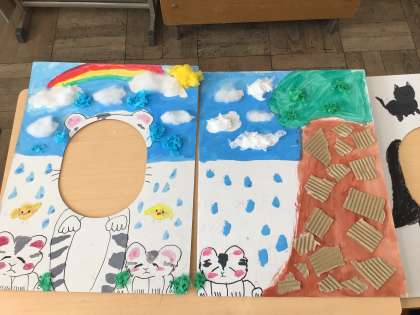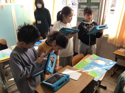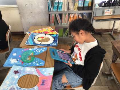 「顔はめパネル」「布でえがくと」の完成した作品を鑑賞しました。友達の作品を見て、よいところをタブレットの発表ノートに書き込みました。素敵な作品ばかりです。