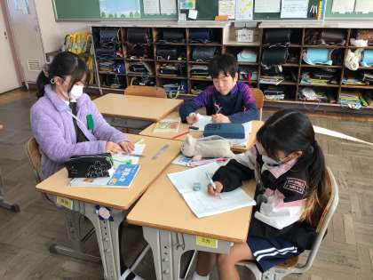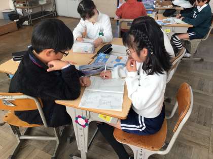わり切れないわり算の筆算の学習です。商は四捨五入して表しますが、四捨五入する前にどこまで計算するのかが間違えやすいところです。心配なところは友達に聞きながら計算を進めています。
