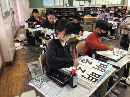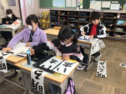 冬休み明けに行われる書き初め大会に向けて練習をしました。4年生の字は「明るい声」です。「る」や「声」を毛筆で書くのが難しいようです。冬休みも練習をして思い通りの字が書けるといいですね。