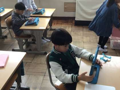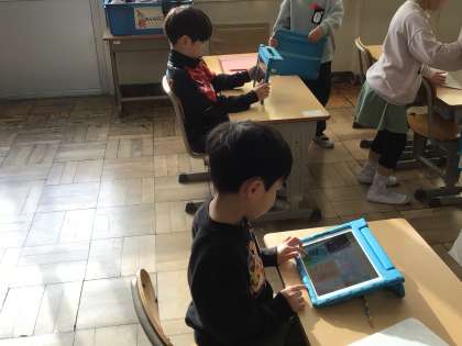 1年生国語では、テスト直しをしてから、学習用タブレットで今まで習ったことの復習をしました。ひらがなや、かたかななどの練習をしました。