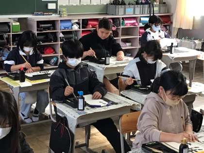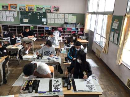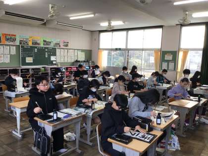 1/7 6年書き初め大会1 公開日 2026/01/07 更新日 2026/01/07 各学年から 6年生にとって平井小学校最後の書き初め大会です。お手本を見ながら、よい姿勢を保って書き上げていました。練習の成果は出せたかな?