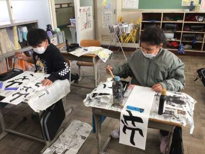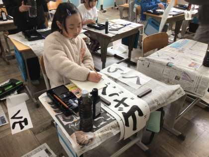 1/7 3年生書き初め大会1 公開日 2026/01/07 更新日 2026/01/07 各学年から 3年生から毛筆の書き初めです。「山ざくら」という字を書いています。お手本に書かれたポイントを確認しながら、一文字一文字丁寧に書いています。