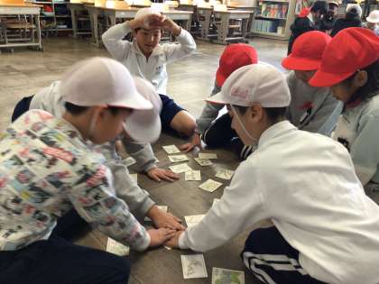 今日のやまびこ遊び(かるた練習)の様子です。1月16日の2限にプチかるた大会を予定しています。どの教室もかるたに夢中になっていました。