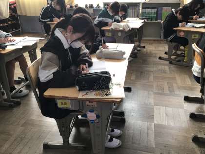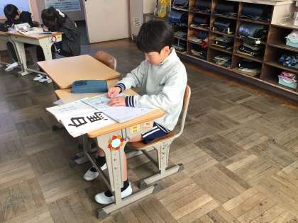 今日は硬筆です。文字の形に気をつけて、ゆっくり丁寧に書いています。背筋を伸ばし、床に足の裏をぴったりとつけ、いい姿勢で書くことができました。