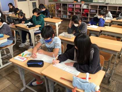 1/9 6年算数 公開日 2026/01/09 更新日 2026/01/09 各学年から 6年算数では、比例・反比例の単元を学んでいます。「表を見てxとyの関係を見つけよう」というめあてで学習を進めていました。個人でどんな関係があるのか、表に書き込みながら考えていました。