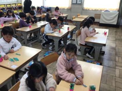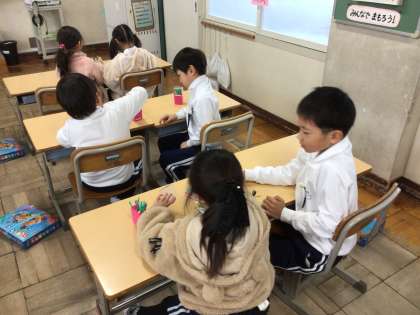 1年生算数では「大きい数」の学習をしています。今日は、数え棒をつかって、棒の数がわかるように10の束にして、ペアで数えまとめました。