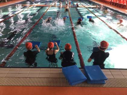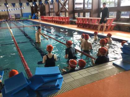 1/14 5年生水泳学習1 公開日 2026/01/14 更新日 2026/01/14 各学年から 今日から5年生はスイミングスクールでの水泳学習が始まりました。スイミングスクールのコーチにクロールの手の動きのこつを教えていただきました。