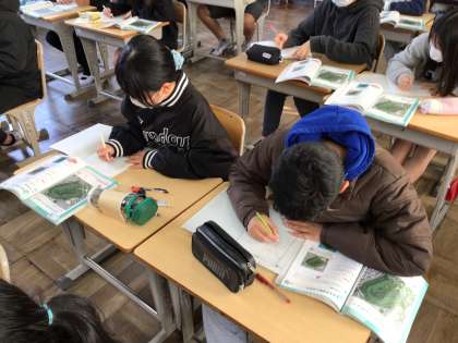 1/15 6年算数 公開日 2026/01/15 更新日 2026/01/15 各学年から 6年算数では、およその形と大きさの学習を行っています。「およその面積の求め方を考えよう」というめあてで、社会科で前方後円墳で有名な世界遺産大仙古墳の面積を求めていました。