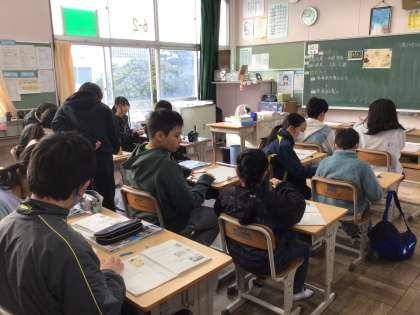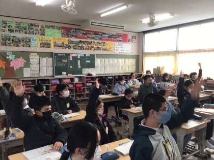 6年生社会科の歴史の学習では、製糸業、紡績業で近代化して行ったことや、陸奥宗光について学習しています。教科書の挿絵を見て歴史的に気づいたことなどを友だちと一緒に考え、発表しました。