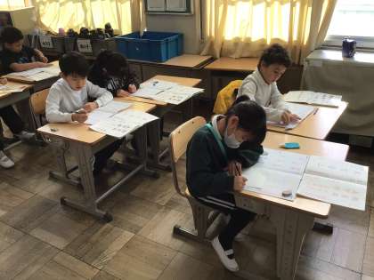 1/21 2年生書写 公開日 2026/01/21 更新日 2026/01/21 各学年から 2年生書写では、字の形に気をつけて書きました。「外形」ということばを習いました。正方形の外形、長方形の外形に気をつけて丁寧に書きました。