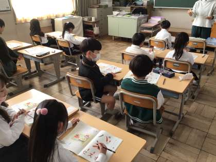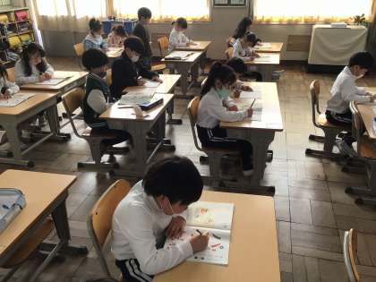 1年生国語では、書写の教科書を使って、ひらがなやカタカナの学習をしました。写真を見て食べ物の名前をカタカナで書いたり、ひらがなで書いたりしました。