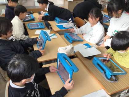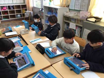 1/23 4年総合 公開日 2026/01/23 更新日 2026/01/23 各学年から 4年総合では、来週の授業参観(学習発表)に向けて準備を進めていました。タブレットを活用しながら、グループで岩本川改修活動の発表準備をしていました。