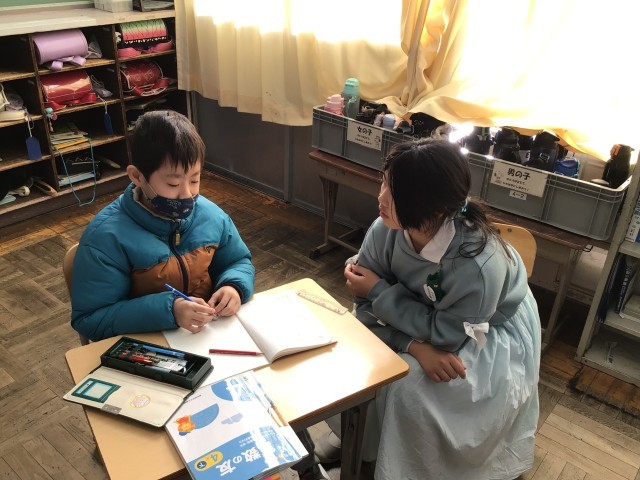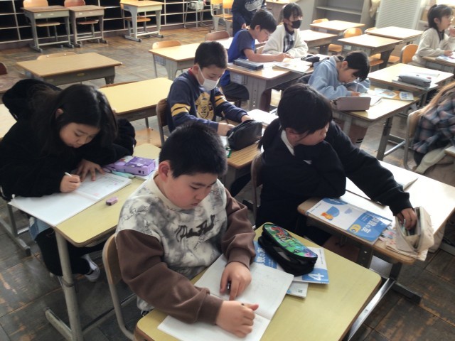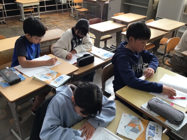 4年算数では、分数の単元を学んでいます。帯分数を仮分数に直す、仮分数を帯分数に直すといったことを復習した後で、問題に取り組んでいました。