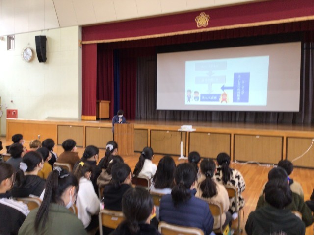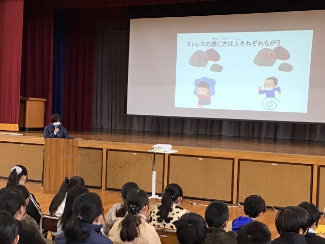 2限体育館で、5年生と保護者を対象に学校保健委員会が開催されました。本校のスクールカウンセラーを講師として、「ストレスをやっつけよう!」というテーマで講演をしていただきました。