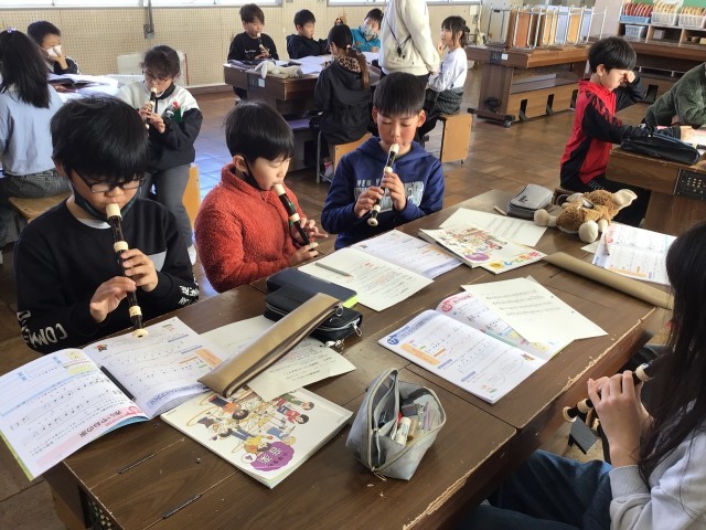 4年音楽では、「旋律をつくってみよう!」というめあてで学習を進めていました。ミ、ファ、ラ、シ、ドからなる日本独特の音階を使って旋律をつくり、リコーダーで試し吹きをしながら確認をしていました。また、友達がつくった旋律も吹きました。