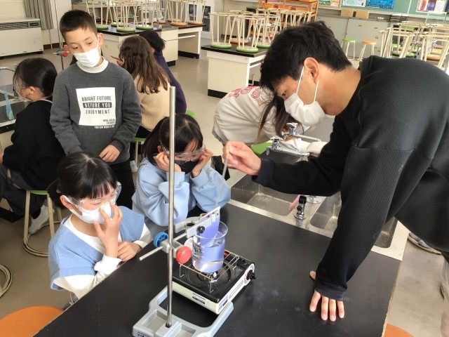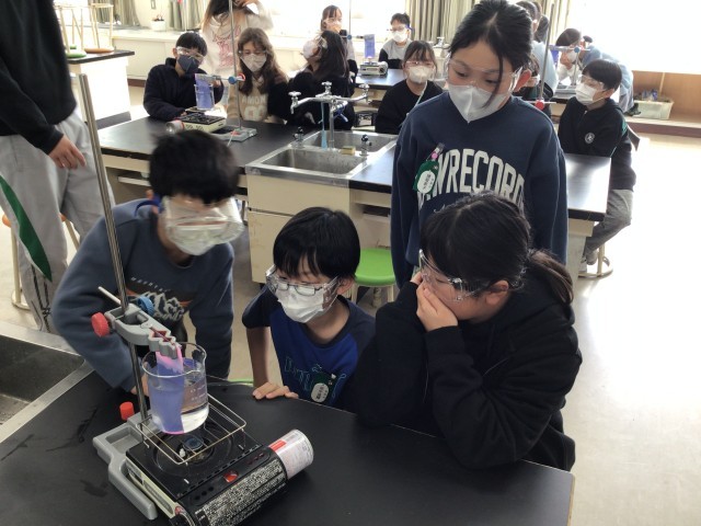 2/4 4年理科 公開日 2026/02/04 更新日 2026/02/04 各学年から 4年理科では、ものの温まり方の単元を学んでいます。今日は理科室で、水の温まり方を実験で調べていました。コンロで加温が始まると、班員全員がビーカーを凝視していました。