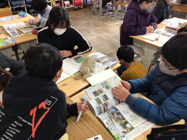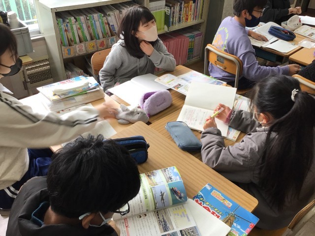 5年社会では、工業生産を支える運輸と貿易の単元を学んでいます。「見つけたことを共有しよう」というめあてで学習を進めていました。教科書や資料集を広げて、気づいたことをグループで話し合っていました。