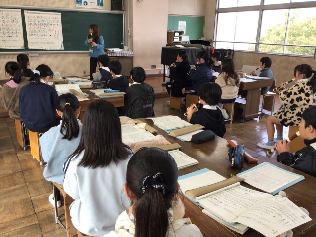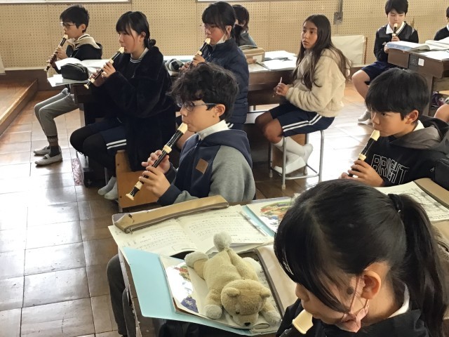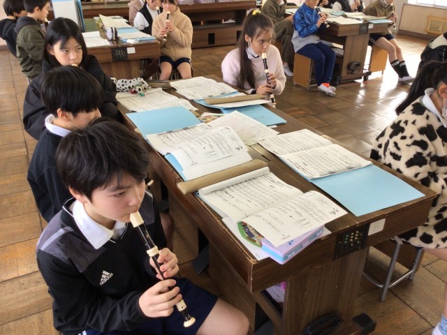 2/6 5年音楽 公開日 2026/02/06 更新日 2026/02/06 各学年から 5年音楽では、「威風堂々」をリコーダーで練習していました。高い音と低い音が両方出てくるので、息の入れ方のコツの説明を聞き、練習を進めていました。