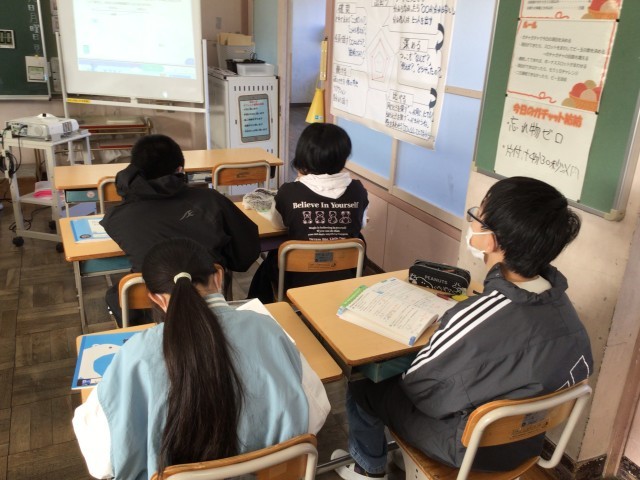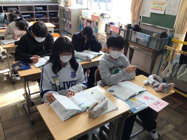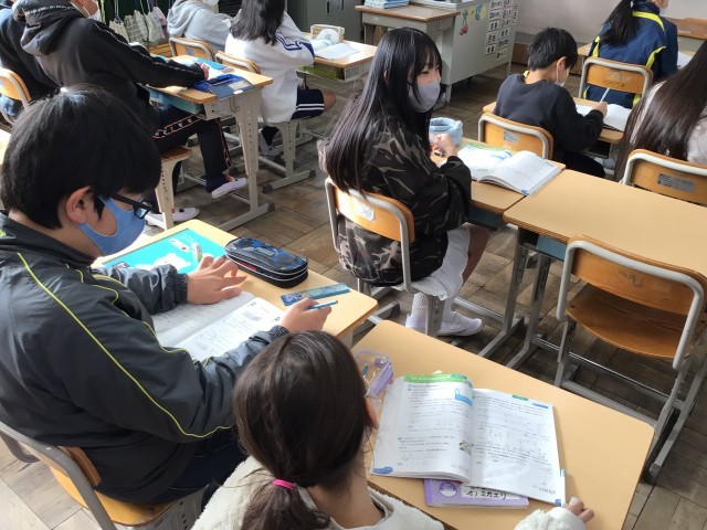 6年算数では、見方・考え方を深めようのところの復習として、算数の友の文章題にチャレンジしていました。問題を図に整理して、個人で考えた後、先生が解説していました。