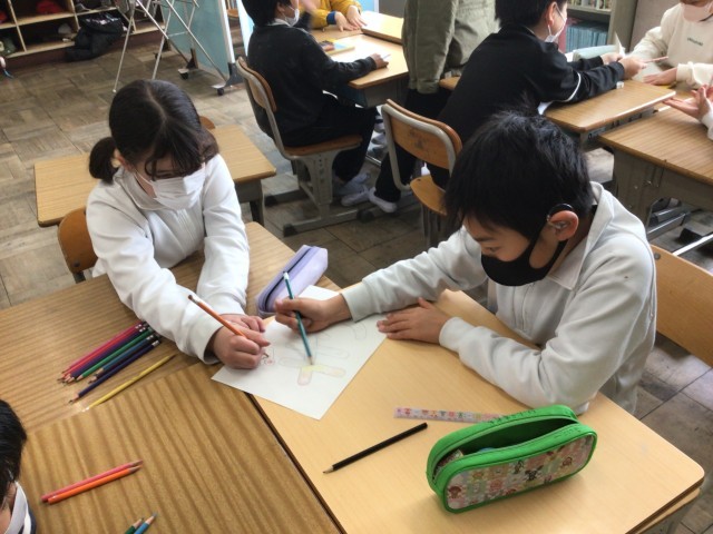 2/10 3年生学級活動 公開日 2026/02/10 更新日 2026/02/10 各学年から 6年生を送る会に飾る「そつぎょう おめでとう」のデザインを班で話し合いました。お祝いにふさわしい、華やかな模様を考えることができました。模様の下書きの後は大きな紙に描いていきます。