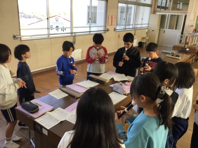 2/12 3年音楽 公開日 2026/02/12 更新日 2026/02/12 各学年から 3年音楽では、「とどけよう このゆめを」と「帰り道」を旋律や曲の山はどこか考えて歌いました。器楽合奏にも挑戦し、「パフ」をパートごとに分かれて練習をしました。