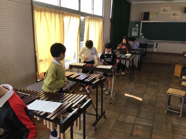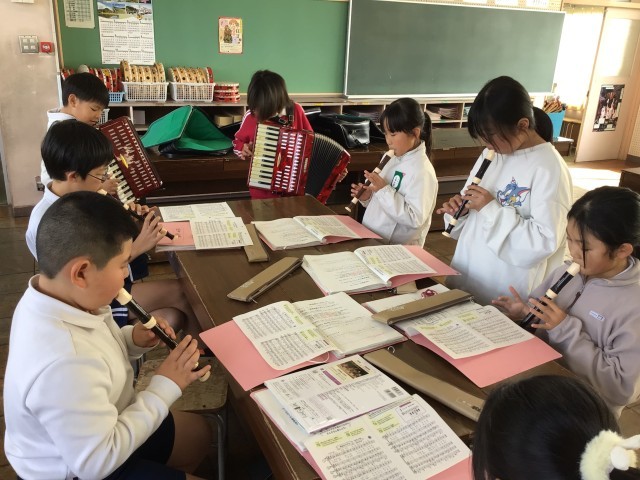 2/16 4年音楽2 公開日 2026/02/16 更新日 2026/02/16 各学年から 4年音楽の「茶色の小びん」のパート練習の様子です。リコーダー、アコーディオン、鉄琴、木琴、オルガンに分かれて練習を進めていました。
