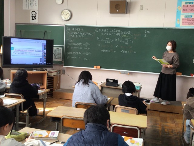 2/24 5年算数2 公開日 2026/02/24 更新日 2026/02/24 各学年から 5年算数の少人数指導の様子です。速さの単元を学んでいて、「1時間あたりに進んだ道のりで速さをくらべよう」というめあてで学習を進めていました。