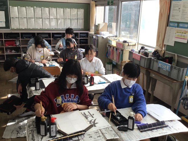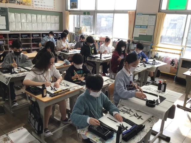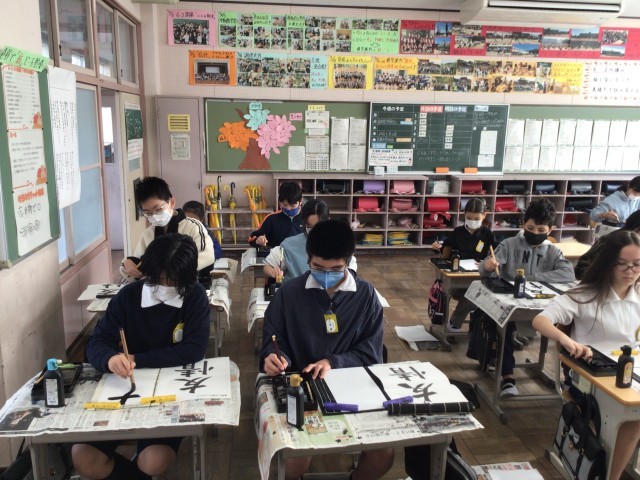 6年書写は、前回に引き続き「友情」という文字を書いています。今日は清書です。字のバランスやはらいなどに注意して丁寧に書いていました。