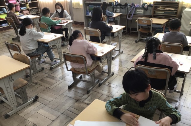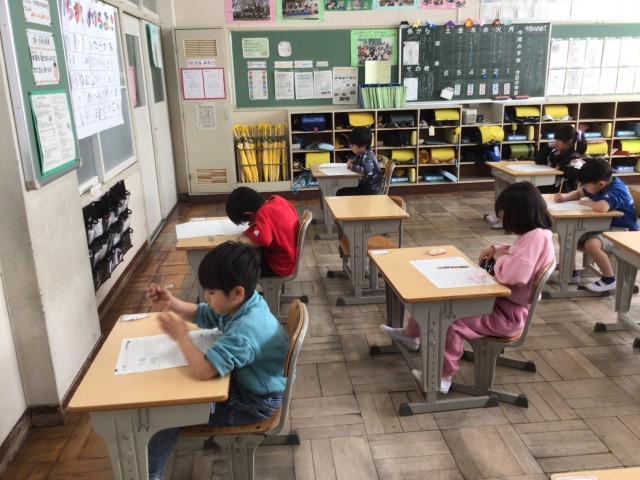 1年生は国語と算数のテストをしました。算数は「おなじ数ずつ」「たすのかなひくのかな」のテスト、国語は「こどもをまもる動物たち」のテストです。みんな真剣に取り組んでいます。