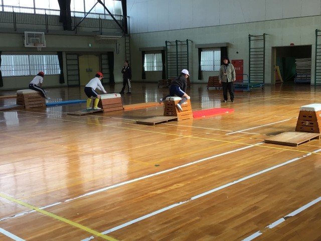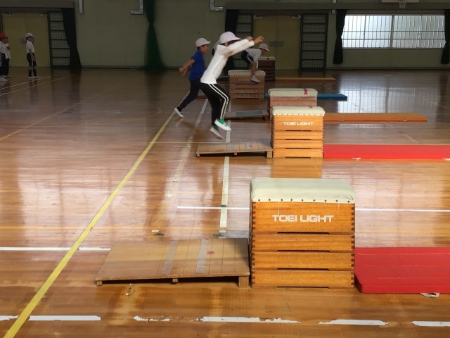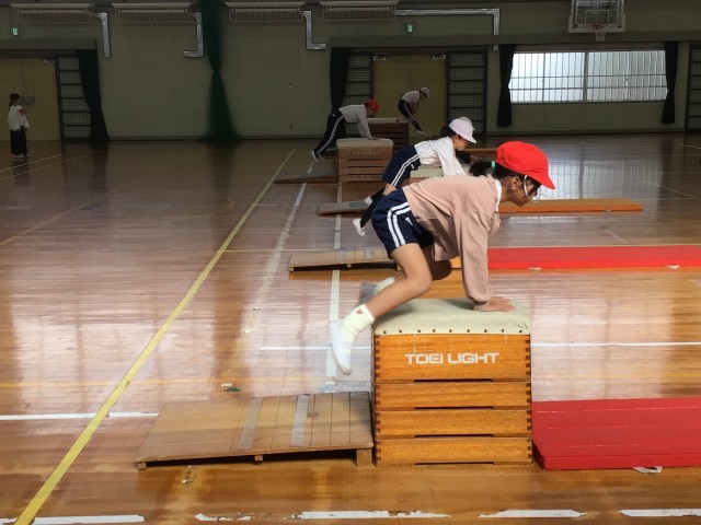 2年生体育では、学年体育で「跳び箱」の学習をしています。上手にとべるように何度も練習していました。高い段でもとべるように、挑戦しています。